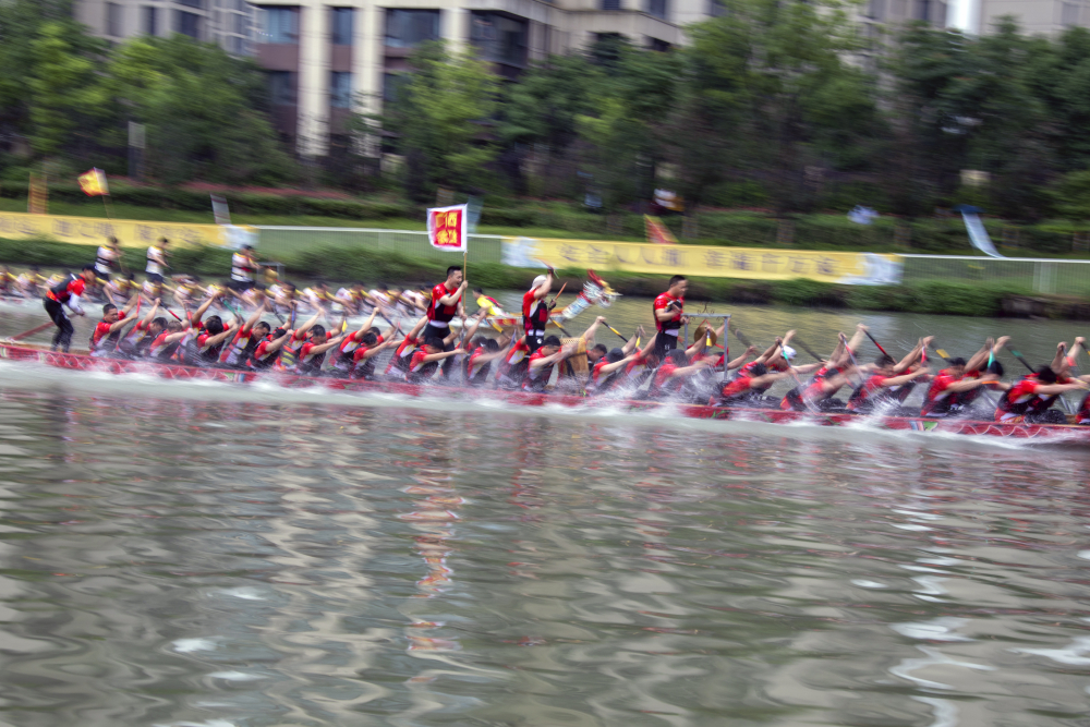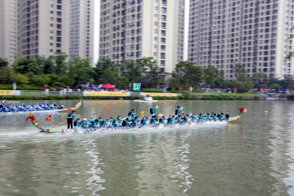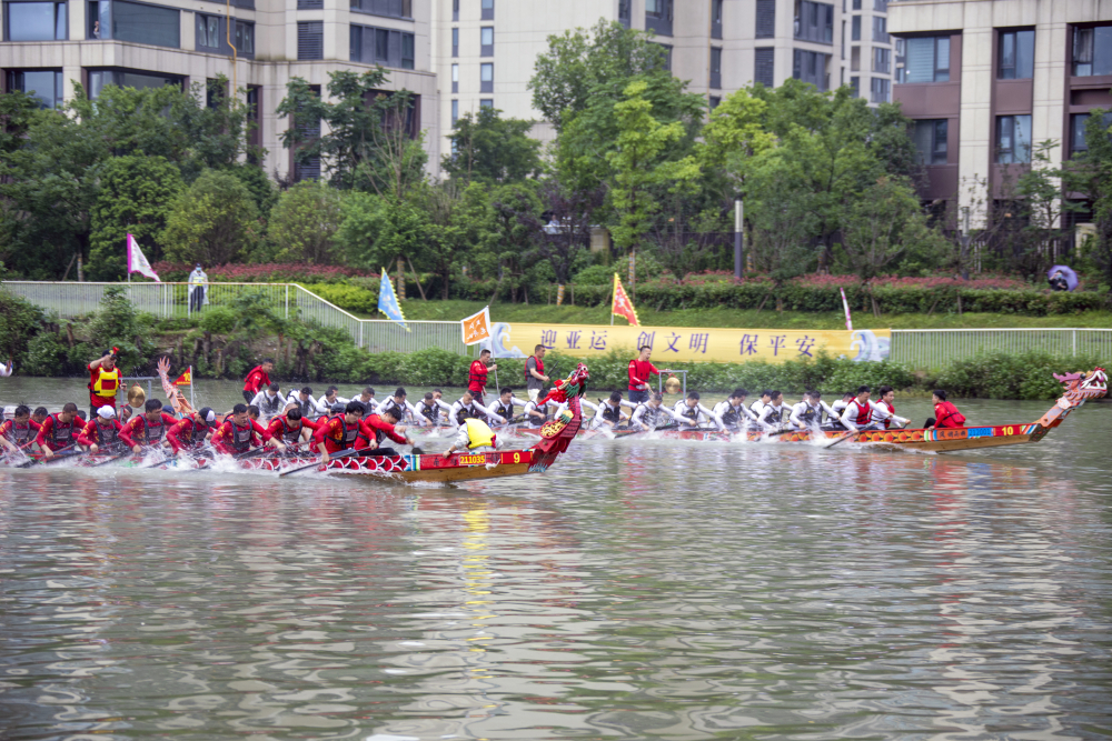 在随后的龙舟竞渡环节中,来自鹿城、瓯海、龙湾、洞头、经开区的16支代表队在河道上展开激烈角逐。在急促的鼓点声中,各色龙舟飞驰前行,龙舟运动员们一边齐声呼喝,一边振臂划桨,所划之处,溅起一朵朵奔涌的浪花,“同舟共济、奋勇争先”的龙舟精神彰显了龙舟作为中华民族优秀传统体育运动的独特魅力和这座城市的高涨热情。第十九届亚运会期间,温州还将承办亚运龙舟赛事,让“千年龙舟”与“亚运激情”在瓯海相遇。