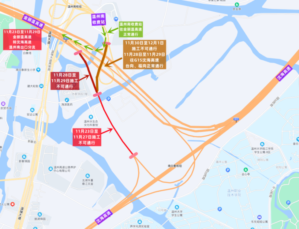 注意:11月28日至11月29日两天,温州南收费站入口往G15沈海高速台州方向、福建方向可正常通行!