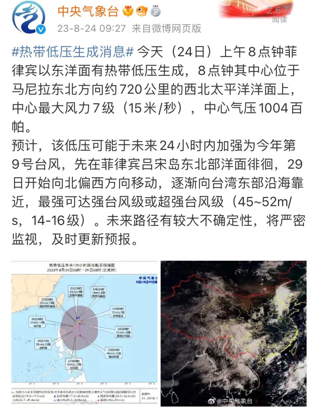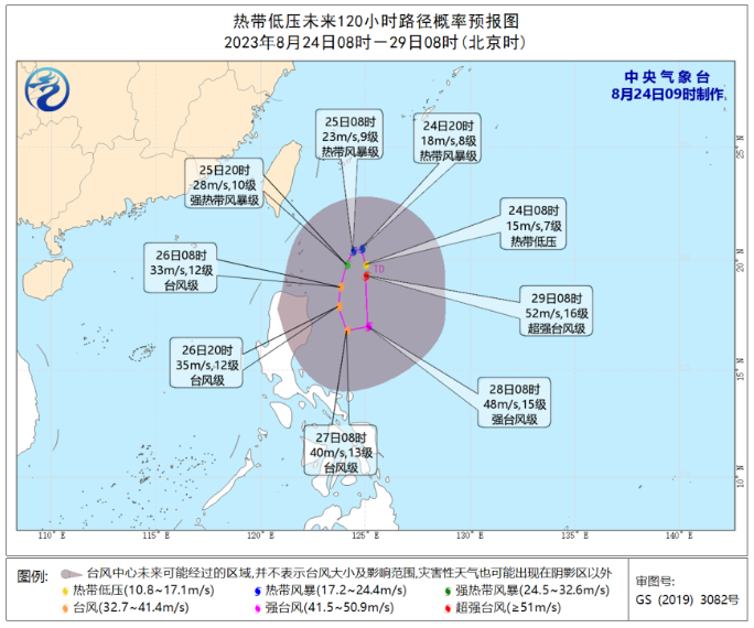 菲律宾以东洋面热带低压已于今天上午8点生成,预计,该低压可能于未来24小时内加强为今年第9号台风,先在菲律宾吕宋岛东北部洋面徘徊,29日开始向北偏西方向移动,逐渐向台湾东部沿海靠近,最强可达强台风级或超强台风级(45-52m/s,14-16级)。