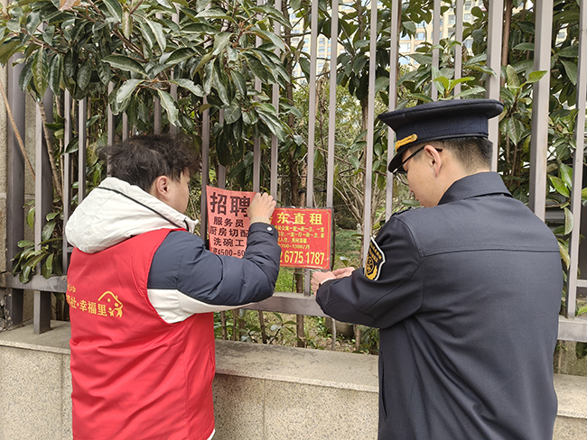12月18日,瓯海区综合行政执法局新桥中队与社区志愿者在诚泰锦园住宅区周边开展“牛皮癣”广告整治。