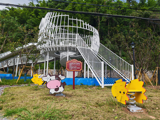 在泽雅水库畔的林岙村,一座藏于山林间的儿童公园成了亲子出游的热门选择。龙前坦儿童公园由村落闲置地块改造而成,以“自然+ 童趣”为主题,布局沙海冒险区、攀爬挑战区、螺旋天空区与休闲陪伴区,木质设施与大地色系融入自然环境。巧妙的是,公园嵌入“浙江有礼”文化:彩绘步道里藏着“跳格子”礼仪游戏,树木间挂着文明标语牌,让孩子在玩耍中感知礼让与责任,实现“寓教于乐”的无形引导,为文旅融合发展提供新样本。