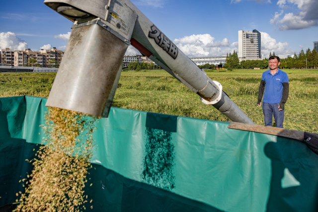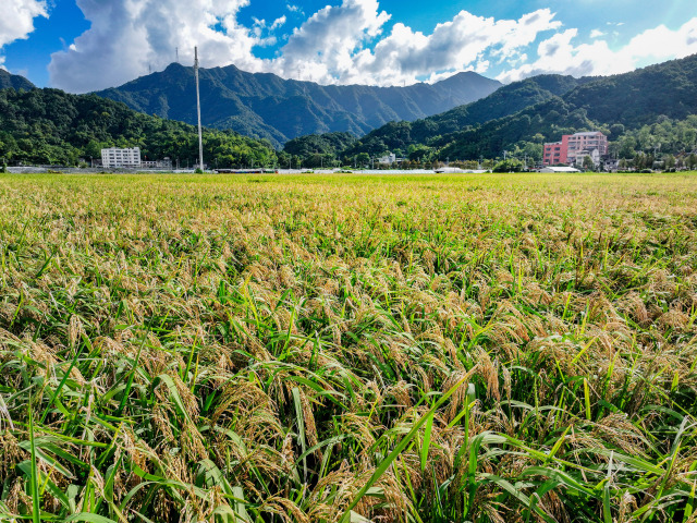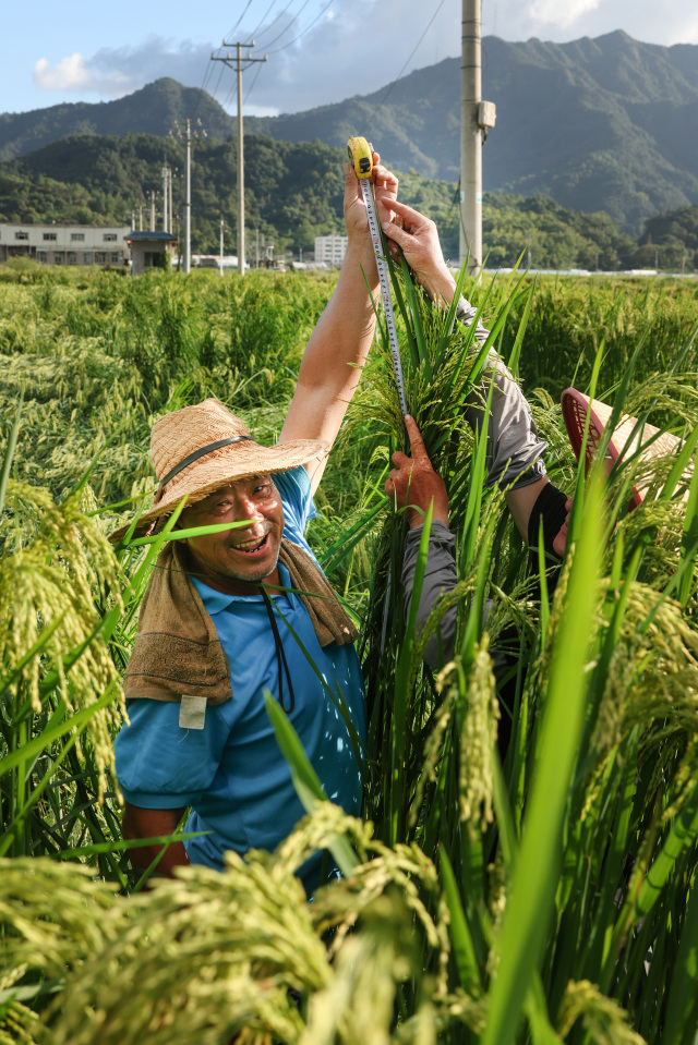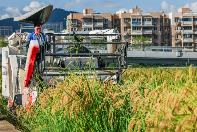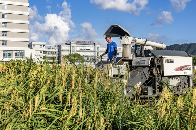 9月25日,温州市瓯海区瞿溪街道蛟垟村的试验田里,一片高达2.1米的巨型水稻迎来丰收。收割机在稻浪中穿梭,稻穗饱满低垂,空气中弥漫着丰收的清香。