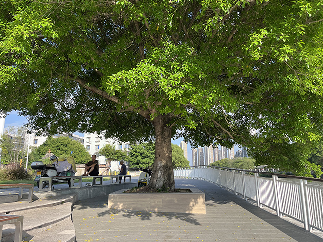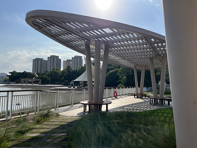 作为瓯海区塘河文化带的重要节点,西山公园此次改造聚焦“功能提升与体验优化”,针对原有设施老化、功能单一等问题进行了系统性升级。曾经顶棚镂空的廊架,如今装上了玻璃顶,遮阳避雨。廊架内新添的玻璃钢座椅,让这里成了名副其实的休憩空间。