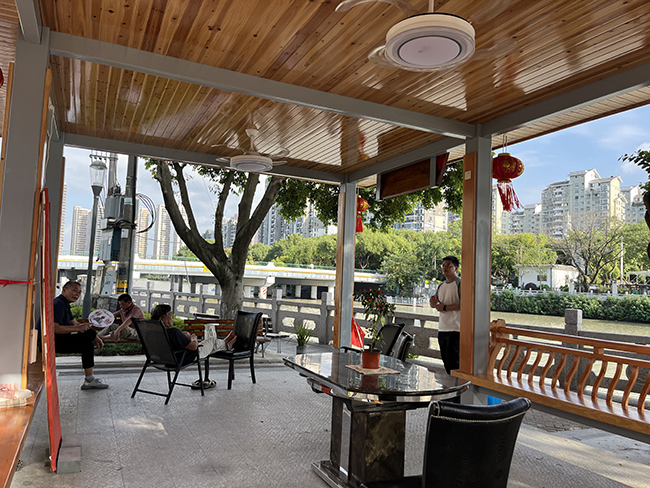 沿河漫步,焕然一新的滨水休闲区令人眼前一亮。原本破损老化的木栈道已更换为木纹PC砖材质,既安全又美观。新增的夜景照明系统,让公园在夜晚同样焕发光彩。而河边“灰炉亭”的诞生,则是社区居民自治的生动缩影。从建设想法提出,到选址、设计方案敲定,全程由居民主导推进。亭子取名“灰炉”,源于温州方言“非论”,寓意“邻里和睦、不吵不闹”,寄托着居民对和谐生活的期盼。项目推进中,居民们热情高涨,自发筹集建设资金5万元,政府同步给予3.5万元补助,政企民同心协力,让原本的闲置角落变身温馨休闲空间。如今,亭内木凳整齐,周边绿植点缀,老人们在此下棋聊天,孩子们围着亭子嬉戏,“非论”的美好愿景在欢声笑语中落地生根。“这个亭子修的好,很多老人小孩过来,大家都很喜欢。”常来公园锻炼的市民胡定昌赞叹道。