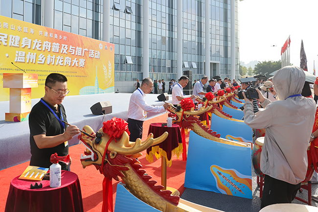 在举行了庄重的传统龙舟“点睛”仪式后,敲鼓鸣锣宣布开赛。中国龙舟协会荣誉顾问、浙江省龙舟协会主席王成云,瓯海区委常委、宣传部部长胡晓立,瓯海区人民政府副区长寿宇飞等参加活动。
