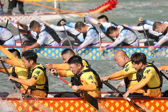 现场,一艘艘龙舟如蛟龙出水,蓄势待发。随着发令枪响,比赛正式开始。刹那间,鼓手抡锤,力贯千钧,富有节奏的鼓点成为所有桨手统一的行动号令。桨手们应声下腰、划水,动作整齐划一,充满力量。一条条龙舟如离弦之箭,在河面上划开一道道白练,奋勇向前。
