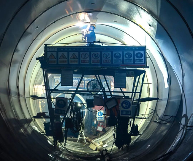瓯江引水公司项目团队突破了因洞径5.5米限制导致的直径4.9米的钢管吊装、测量和焊接等技术瓶颈。自2025年3月施工以来,团队采用定制化运输,加强人员引导,安排专人指挥调度,车辆轮胎从普通空心胎调整到加强胎、实心胎,优化焊接工艺,采用单面焊接双面成型工艺,以“5+2”“白+黑”连续作业模式,7个多月实现1.6公里钢衬段的零误差安装。