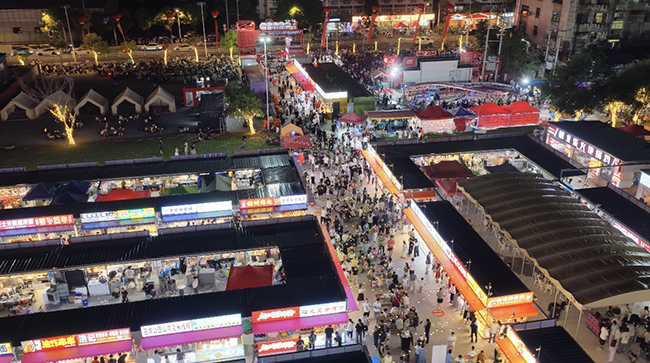 夜幕降临,华灯初上,紧邻园博园国际景区主入口的郭溪·园博共富市集迎来熙攘人流,烟火气在这里升腾。