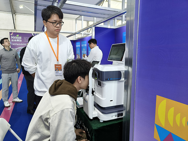 前来观展市民金智宇对中国基因药谷展位上摆放的全自动电脑验光仪颇为感兴趣,坐下不到一分钟,他便获得了视力数据。“不需要有人在旁边,因为机器会指导我,效率很高,结果出的又快又准。”金智宇直呼体验感不错。这款产品来自于温州清大智能制造有限公司,实现了从登记、检测、数据采集与存储、分析反馈等全流程自动化操作。“在此基础上,我们还采用轻巧便捷的运动结构生产出全球首款便携式智能验光仪,更适用于各种各样的筛查场景,以及全球首款眼前节成像仪,是专为白内障等疾病高发人群设计的便携式智能检测设备。”温州清大智能制造有限公司品质负责人何继圣向记者逐一介绍展出产品。