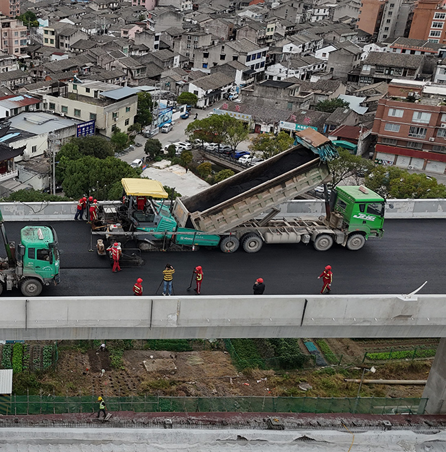 施工现场,工程车辆穿梭不息,施工人员正紧锣密鼓地进行2标段高架桥面的沥青铺设作业。项目团队正全力以赴推进施工,计划于农历年底前实现高架通车至仙岩段,进一步优化温瑞一体化交通网络布局。