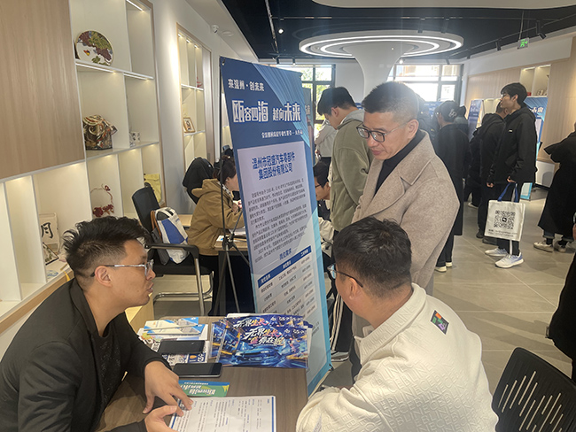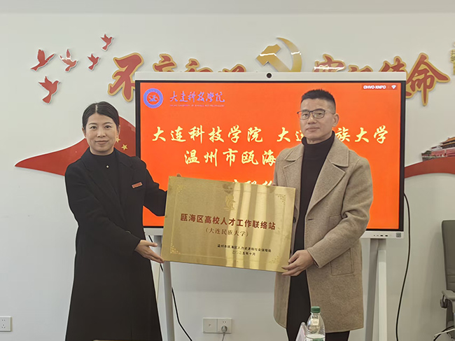 在大连科技学院,双方还围绕深化校地合作展开交流,并举行“瓯海区人才联络站”授牌仪式,标志着瓯海与高校合作迈入新阶段。现场,来自电子商务专业的温州籍学子郑书杭难掩激动之情。作为土生土长的温州人,他始终心系家乡发展,此次瓯海携众多优质企业入校招聘,让他倍感亲切。“能在家乡的企业找到专业对口的工作,一直是我的心愿。这次引才活动给了我宝贵的机会,毕业后我一定回到瓯海,为家乡建设贡献力量!”郑书杭说道。