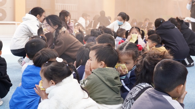 随着急促的警报声响起,消防安全演练正式拉开序幕。全园15个班级的409名幼儿在62位教职工的有序引导下,迅速拿起湿毛巾捂住口鼻,弯腰低姿、不推不挤,沿着预设安全路线快速向操场指定疏散区域撤离。整个过程紧张有序、衔接顺畅,仅用时三分钟,全体师幼便全部安全集结,展现出扎实的应急避险素养与良好的团队协作能力。