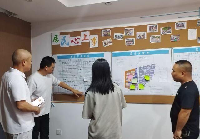 经居民推荐和口碑考察,社区从党员骨干等群体中选拔出55位楼栋长,负责收集反馈邻里民情,构建起“社区-网格-楼栋长”治理架构。每个网格团队都有一张自制“民情地图”,动态记录关键事,与楼栋长定期会商,并通过网格走访、楼栋微信群等方式收集“金点子”建议。对于居民自身无法解决的问题,由网格逐级上报、流转交办;疑难问题则被纳入“五重清单”集中攻坚。今年,社区已立项形成就业帮扶、乐龄关爱等“居民心上事”项目25件,成功处理事件332条,化解重点纠纷58起。