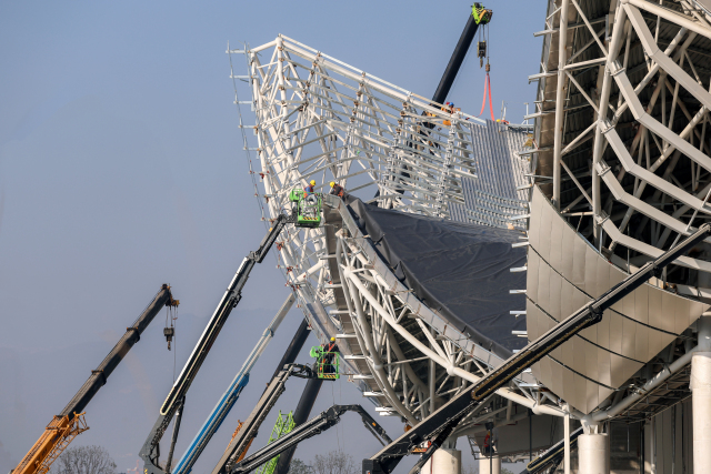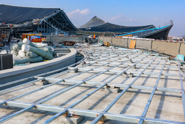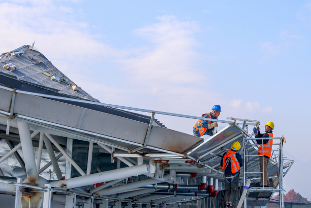 12月1日,园博园核心建筑山水中国馆金属屋面工程已全面进入收尾阶段。目前,金属屋面系统的所有主体构造层(基层、保温、防水、装饰面板)及关键受力部件(抗风夹)已完成90%。该工程由中建二局负责施工建造,工程正按计划有序推进,施工重点已转向安装铝合金龙骨支撑体系,部分区域已完成安装,为后续屋面附属设施施工奠定基础。该金属屋面是展现建筑现代技术与山水意境融合的重要部分,其高效推进为园博园整体工程如期完成提供了坚实保障。