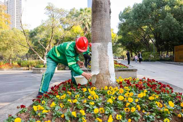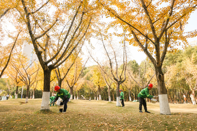 降温在即,连日来,瓯海区综合行政执法局组织绿化养护单位为全区道路、公园、附属绿地内的树木开展涂白作业,为树木穿上“防护衣”,助力树木御寒防虫、温暖过冬。