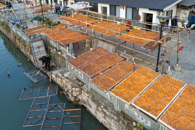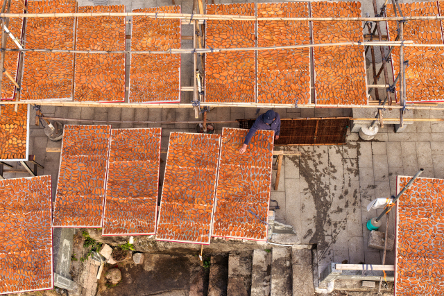 番薯干,温州也称作“番薯枣”。连日来,瓯海区仙岩街道社帆村村民趁着天气晴好晒制“番薯枣”。该村已有20余户村民参与晒制,在院前屋后铺开仿佛连成了“金色海洋”。当地村民将番薯晒制成“番薯枣”销售,使番薯价值翻倍的同时,也让家庭增收。