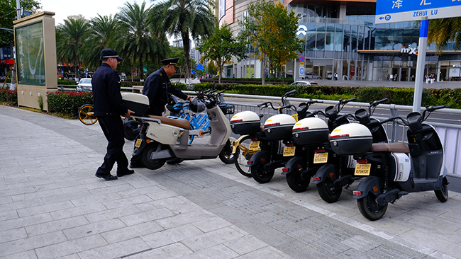 12月9日,记者跟随瓯海区综合行政执法局南白象中队来到温州万象城附近,执法人员沿着主次干道、商业综合体周边等人行道区域进行全面巡查,将未停放在规定区域、妨碍通行的共享单车及电动自行车逐一扶正,归位至停车线内。