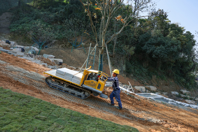 项目二标段需在老虎山、仙门山完成林相改造,种植乔木超1.2万棵,实现四季彩化。面对陡峭山体,传统运输效率低下,项目创新引入“黑科技”组合:重载无人机化身“空天吊车”,将苗木、建材精准“空投”至百米山顶,单次作业仅需2分钟;同时,“爬山虎”履带运输车发挥强大爬坡与载重能力,在崎岖山道上稳定托运大型物资,形成有力地面补充。