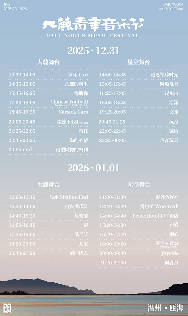 当新年的钟声将至,音乐节的音浪也蓄势待发。2025年12月31日至2026年1月1日,为期2天的温州大麓青年音乐节将在瓯海举行,届时将有裁缝铺、椿、麻园诗人、回春丹等32组艺人轮番登台演出,为乐迷朋友带来一场无与伦比的视听盛宴。