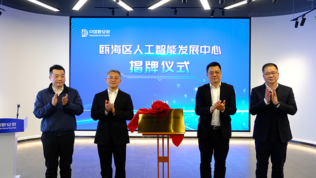 1月4日,瓯海区人工智能发展中心在中国(温州)数安港揭牌成立。作为全国首个区县级人工智能发展中心,标志着瓯海区在人工智能产业政策创新方面迈出了关键一步。瓯海区委书记刘云峰、代区长季湘荣、温州市数据局(市人工智能局)副局长金传拉,瓯海区委常委、组织部部长董敢参加揭牌,区领导郑益群、金海敏出席活动。
