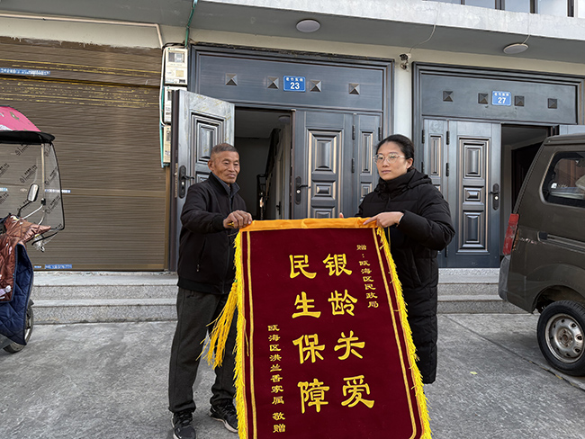 1月7日,瓯海区潘桥街道的谢老伯将一面印有“银龄关爱民生保障”的锦旗送至瓯海区民政局相关工作人员手中。