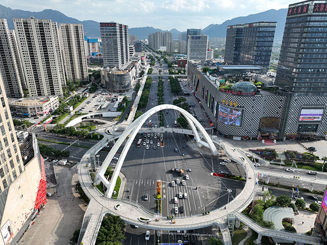 瓯海的城市辨识度,在高铁新城中得到进一步展现。站在温州南站向东望去,宁波路沿线车水马龙、高楼林立,一座环形空中连廊将铁路温州南站与大象城国际商贸中心、站南商贸城、港龙国际广场、君廷大酒店等商业综合体巧妙串连。一出车站就是商贸圈,高铁新城为市民搭建起一座可行、可观、可玩的“城市阳台”,超百万平方米的大型商贸综合体,成为瓯海商贸最通达、最集聚、最活跃的板块。