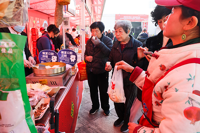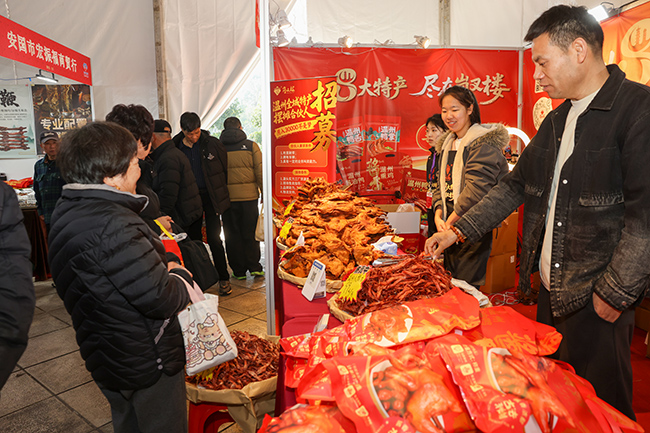 开市当天,活动现场人流如织、购销两旺。120个摊位在广场整齐布设,现场煎制的泽雅豆腐鲞喷香扑鼻,雁荡山铁皮石斛尽显地道品质;西藏雪域肉干风味独特,诸暨珍珠饰品光彩熠熠……特色农产品、非遗手作、迎春好物等多个品类一应俱全,汽车、鞋服、眼镜等产品也同步亮相。“今天我们代表西雁度假村,把泽雅山货带到温州市区,有瓯美人、黑豆酒、田鱼干等特产,其中茅草根一度热销。”泽逸瀑布咖啡店店主季炜俊说。来自重庆川将军食品有限公司的林世杰则跨越1600余公里,带来丰富的腊肉制品,同样收获大批市民的青睐。