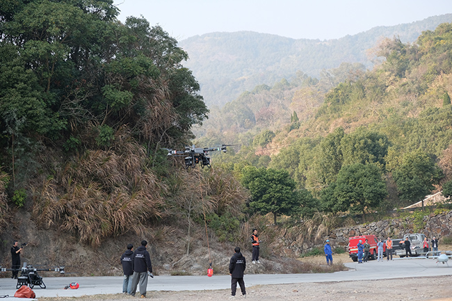 演练中,无人机技术扮演关键角色:率先利用无人机进行火场快速侦察与实时三维建模,为指挥部提供精准的火场态势图;组织大载重无人机执行应急物资精准投送、灭火弹定点抛投、消防水带吊运与吊桶灭火等多项特种任务,展现无人机在复杂地形下执行多样化任务的能力。与此同时,地面专业消防力量展开攻坚扑救,并与直升机吊桶灭火作业形成空地协同作战体系,高效压制火势。明火扑灭后,再次运用搭载红外热成像设备的无人机进行火场余火侦查与清理,确保扑救彻底、防止复燃。