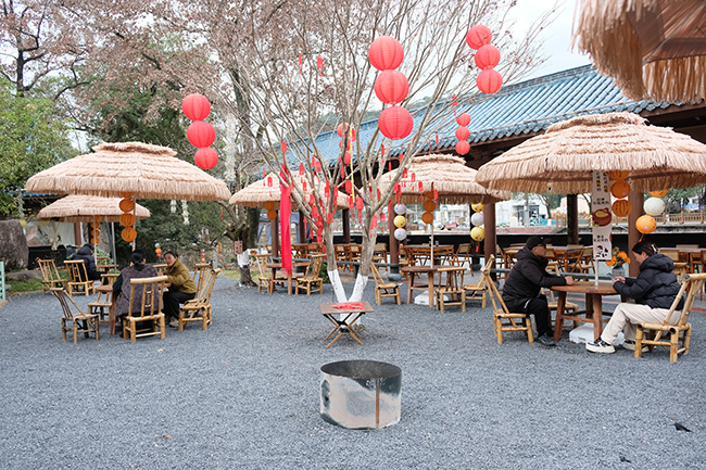 从垃圾堆积点到健康活力场,当社区里的闲置空间被赋予民生温度,瞿源村的老旧建筑也正借着“微改造·精提升”重获新生,雾里·桃喜茶咖便在这份蜕变中应运而生。走进这座新中式茶咖空间,白墙黛瓦映着金溪碧波,古色古香的屋檐廊角间红灯笼高悬,围炉煮茶的客人络绎不绝,年味愈发浓厚。
