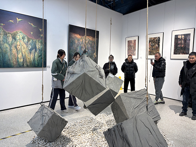 作品中,素描《云影》《山色》等勾勒出纸山的灵秀肌理;水彩《纸山人家》《窗外》系列晕染出乡土生活的诗意。油画《山行》系列传递出坚韧精神,而铸铁《铁影群山入梦》则实现了传统山水与现代材质的碰撞。非遗板块亮点纷呈,剪纸《青嶂叠云》《影映溪明》将山水意境融入镂空艺术;竹编风铃、船模等手作让古老技艺贴近当代生活。装置作品《犁耕岁月》以纸为核心进行跨界创作,生动诠释了展览主题。