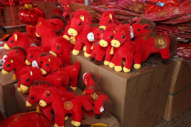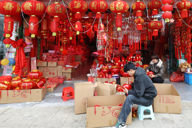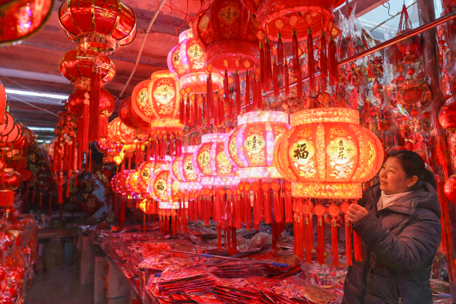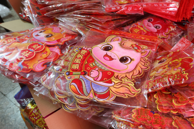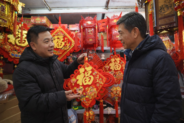 连日来,不少市民在瓯海区景山街道过境路商铺观赏、选购新春饰品。随着春节临近,各类马年新春饰品火热上市。现场,马年福字、马年公仔、大红灯笼应有尽有,年画、春联、中国结等充满喜气的传统年货琳琅满目,透着浓浓的年味,吸引周边众多顾客前来选购,新年的喜庆氛围越来越浓。