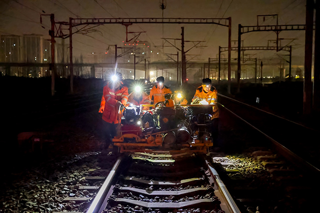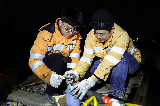 寒风刺骨,指尖早已冻得发麻,但雷槟槟的动作丝毫没有松懈。“松开螺栓要注意顺序,新轨缝必须控制在6毫米……”他一边默念操作规范,一边有条不紊地执行每一道工序,与工友默契配合,拆卸旧接头、涂抹专用胶水、精准对位新接头,每一个步骤都严谨细致。50分钟后,旧接头顺利移除,新接头精准安装到位。