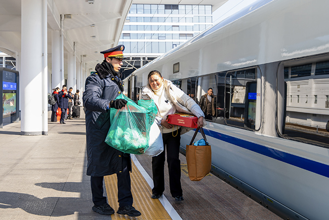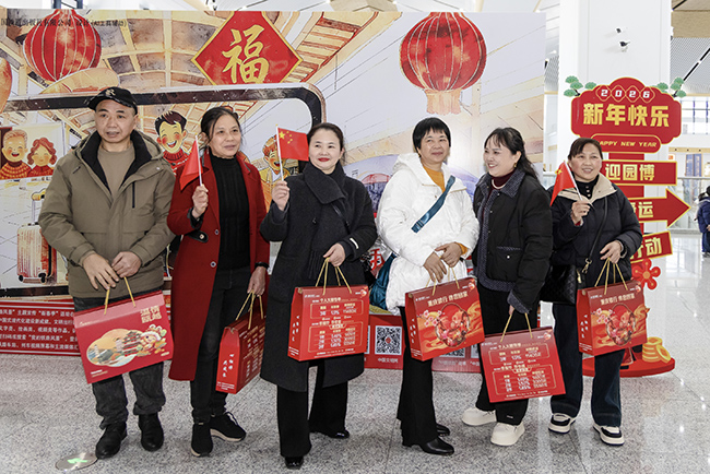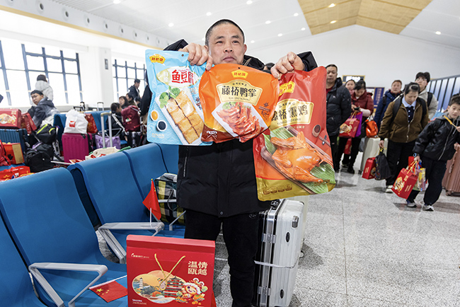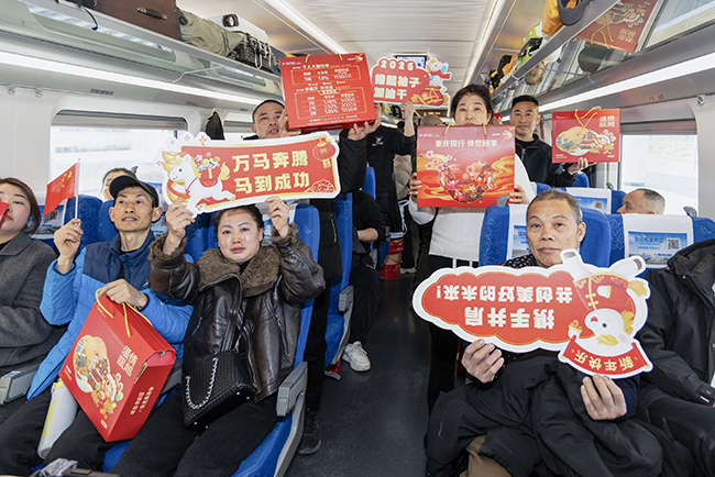 欢送仪式在铁路温州南站西候车室举行,现场向在温务工人员致以节日的问候,并送上新春慰问礼包。“以前过年回家,得先挤绿皮火车到贵阳,再买去宜宾的高铁票,一路折腾下来差不多要两天才能到。现在坐上这趟列车,10个小时就能直达宜宾,比过去方便太多了。今天上午从温州出发,晚上就能让家人尝到新鲜的温州味道了。”在温务工12年的姚云海翻看着礼包内藤桥熏鸡、鸭掌、鱼豆腐等温州特产,满心感慨地说道。