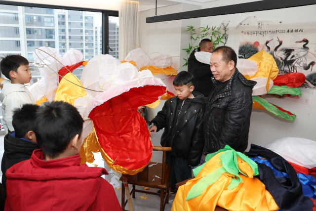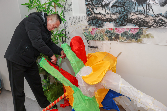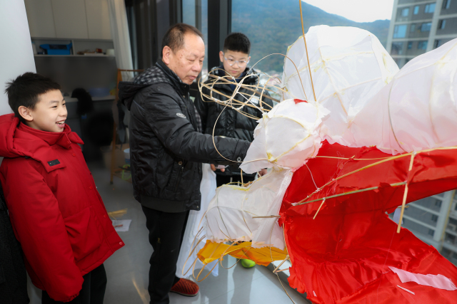 2月11日,年关将近,浙江省非遗代表性传承人王大普在家中赶制正月十三慈湖南村传统非遗龙灯。他一边精心制作非遗龙灯,一边为社区儿童讲解瓯海传统年俗,在竹篾翻飞间传递文化薪火。