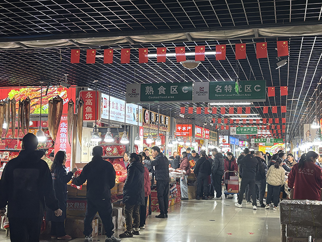 往来市民提着购物袋、推着小推车,或是围着摊位,驻足挑选自己心仪的干货。“每年都来这里备年货,品类全、价格实,来一趟买好要用的,很省心。”红色围巾映衬下的市民陈阿姨满脸喜悦,边挑鸭舌边说道,她另一只手里还提着红色塑料袋,里面装着烤虾干、酱油肉。