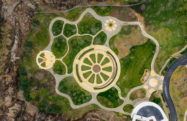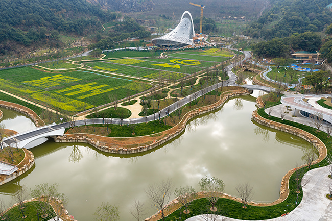 漫步南园,既能感受自然之美,也能窥见特色建筑的设计巧思。虽暂未开放,但南园主建筑葳蕤馆已颇具视觉冲击力,以“盛世之贝”为设计理念的温室花园,贝壳状的造型镶嵌于绿谷之间,高透超白玻璃外立面在阳光下熠熠生辉,让人对其内部的世界花草景观充满期待;不远处的绿谷花街(绿谷研学基地),以自然曲线勾勒的建筑轮廓与水岸景观相映成趣,地景化的设计让建筑与山体浑然一体,未来这里将成为集生态餐饮、花卉研学于一体的亲子研学打卡地。而总长约390米的仙道无障碍架空栈道,坡度平缓,视野开阔,站在观景平台可远眺南园全景,成为园区里的一大观景亮点。