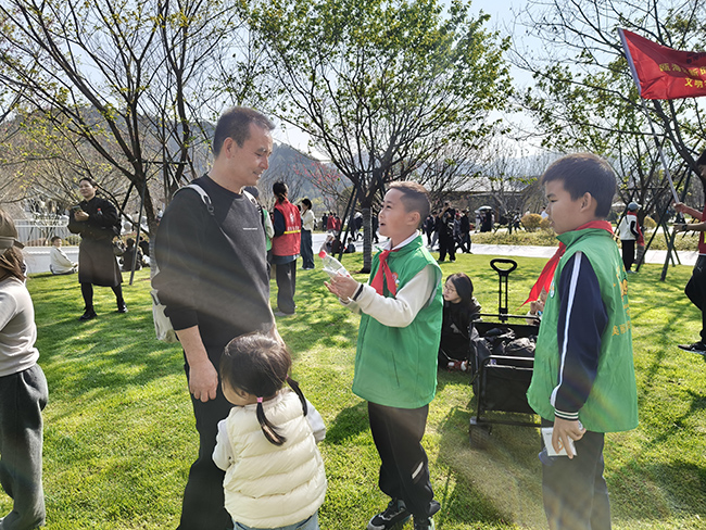 仪式后,各志愿队伍按照既定路线分组开展实践活动,一场学雷锋、传文明的行动在郭溪街道多地同步展开。园博园内,志愿队伍开展文明游园宣传,向游客发放灭烟袋、旅行头枕等礼品,引导大家遵守游园秩序,爱护园区环境;霞榕路霞景小区,志愿队伍手持垃圾夹、垃圾袋,开展垃圾随手捡行动,同时向居民发放宣传资料,普及垃圾分类知识,让环保理念深入人心;在郭溪街道繁盛路、景德路的沿街餐饮店,志愿队伍入户开展文明餐桌宣传,倡导光盘行动、文明用餐。“我们要以雷锋为榜样,从身边小事做起,争做礼迎园博的文明小使者!”温州大学附属茶山实验小学五年级学生郑琛然表示。