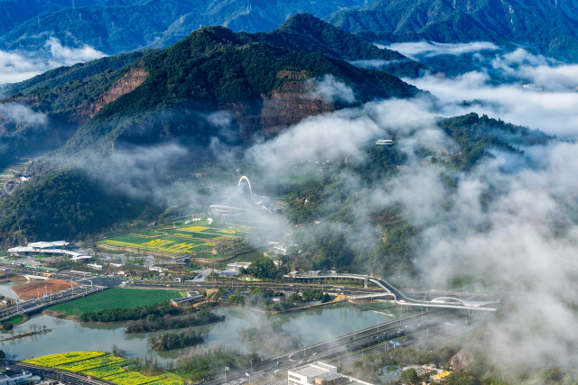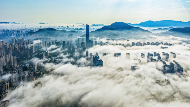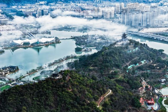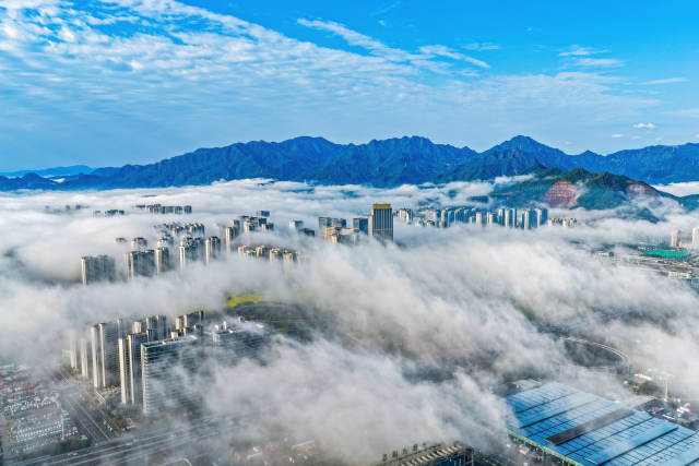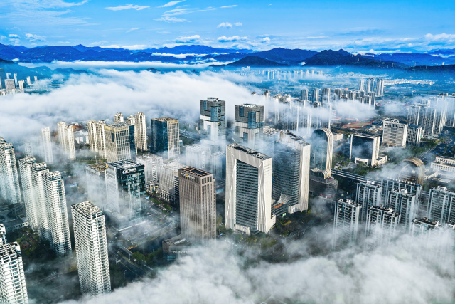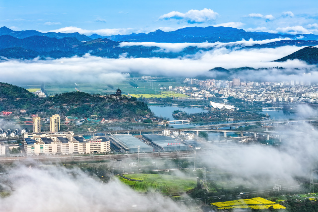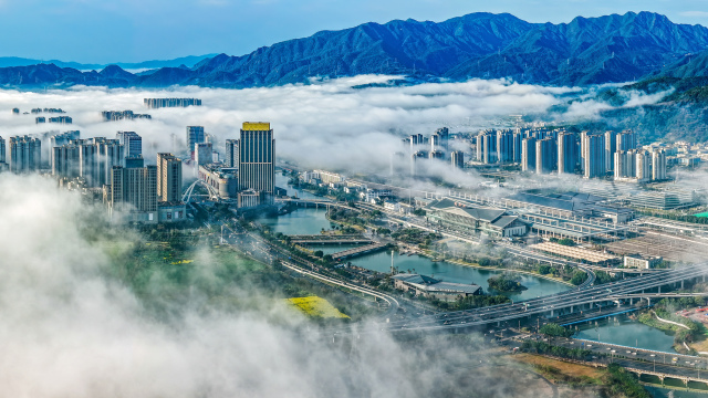 3月2日上午,瓯海上空出现罕见的平流雾景观。从高空俯瞰,整座城市被浓厚的平流雾轻柔笼罩。高楼大厦在雾海中若隐若现,楼宇的轮廓在雾气中变得柔和,仿佛海市蜃楼,又似空中楼阁。雾气随风流动,为城市的天际线披上了一层神秘的面纱,构成了一幅壮美的早春雾景图。