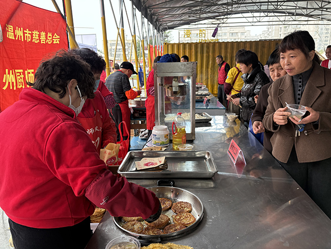 上午9点,园博共富市集内热气腾腾、香气四溢。鱼丸汤、炒粉干、灯盏糕、青团等温州传统特色小吃一字排开,吸引了众多居民前来品尝。这些美食由主办方精心准备,邀请当地居民以及曾参与园博园建设的建设者、管理者共同品尝,以舌尖上的“温州味道”传递城市温情,迎接园博盛会的到来。