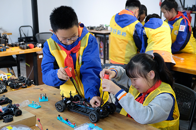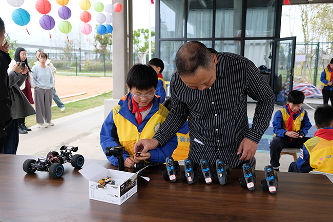 在老师的带领下,孩子们认真学习了汽车发动机的基本原理,动手拆解车辆模型的发电机、连接电路正负极,在趣味手工中探索科学奥秘。随后,他们还亲自在跑道上操控车辆模型竞速,体验游戏与科学相结合的乐趣。