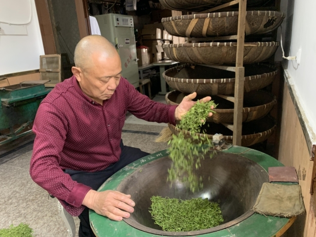 这些年,制茶的设备也在不断迭代。从早年的柴火锅,到控温更均匀的电炒锅;从忙12个小时,最多仅能炒出4斤茶叶的纯手工炒茶,到引入机器后,一天能炒120多斤的半手工炒茶,效率大大提升,助力早茶抢“鲜”上市。