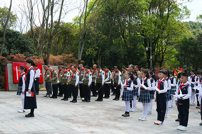 祭奠环节中,全体人员向烈士敬献花篮、白菊、千纸鹤,并鞠躬致敬。瓯海区瞿溪第一小学的学生以诗歌朗诵《我们不会忘记——致敬英烈》的方式,致敬革命先烈。学生代表金灿灿表示:“正是先烈们用鲜血和生命换来了我们现在幸福安宁的生活。作为新时代的少先队员,我们一定会铭记历史、珍惜当下,好好学习、茁壮成长,传承红色基因。”
