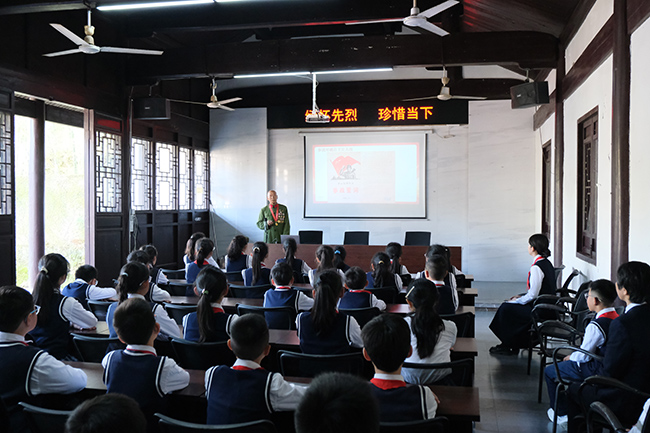 革命烈士英名墙前,师生和退役军人在雄壮的国歌声中肃立默哀。“矗立在我们面前的是瓯海区革命烈士英名墙,上面刻有179位瓯海籍烈士的名字......”在场人员仔细聆听郭溪景德寺的红色历史及温州和平解放谈判的峥嵘过往,被先烈们坚定的理想信念和无私的奉献精神深深打动。