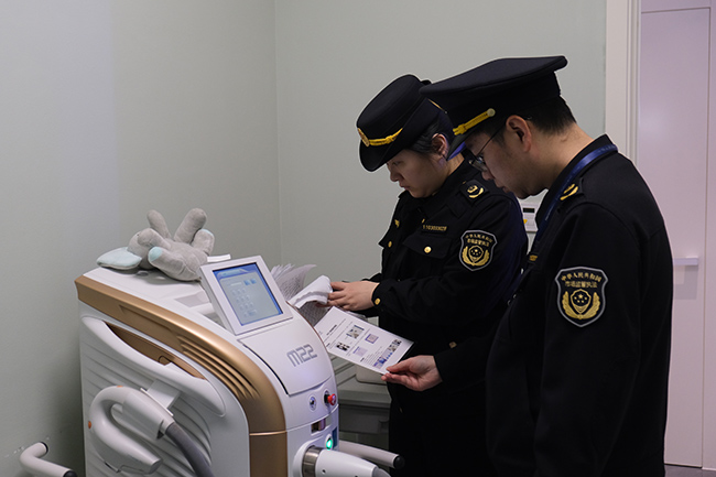 执法人员来到老百姓大药房(新桥店),重点检查企业经营许可及备案凭证是否合法有效、进货查验记录是否完整规范,尤其针对第三类医疗器械的产品资质、陈列储存及有效期管理等情况进行细致核查,严厉查处销售过期失效、无合格证明文件医疗器械等违法违规行为。随后,执法人员来到温州林和敏医疗美容诊所,聚焦医用美容器械使用环节开展检查,详细查看器械采购渠道、维护保养、使用记录等情况,进一步规范医美机构诊疗用械行为。