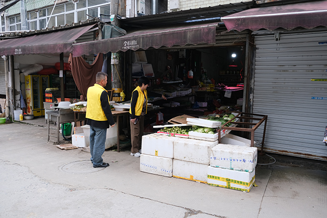 随后,监督员来到陈岙村,该村道路本就狭窄,菜市场周边的环境问题更显突出。监督员看到,市场周边路面有几处破损坑洼,转角处的垃圾房老旧,还有个别塑料袋、包装纸等散落在地面。部分商户还存在占道经营现象,将商品摆放在人行道上,进一步挤占通行空间,让原本狭窄的道路更显拥挤。