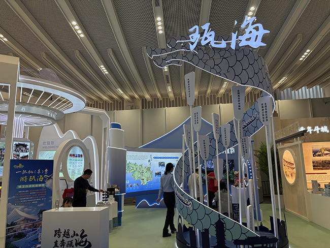 瓯海区综合行政执法局园林绿化科负责人董茵子介绍,瓯海临展区以“水岸共生·塘河瓯韵”为设计主题,将塘河文脉与城市蝶变融于一境。展区背景以岸边人家建筑剪影为基底,徐徐铺展瓯海文旅画卷;主视觉以腾飞的巨龙为核心,既承载瓯海千年龙舟文化的水岸基因,也象征瓯海五次蝶变的昂扬腾飞之势。展区底部以瓯海地标建筑剪影呼应水岸共生,龙舟鼓造型则凝聚着同舟共济、奋勇争先的精神,全方位展现瓯海依水而兴、向海而行的发展脉络与人文底蕴。
