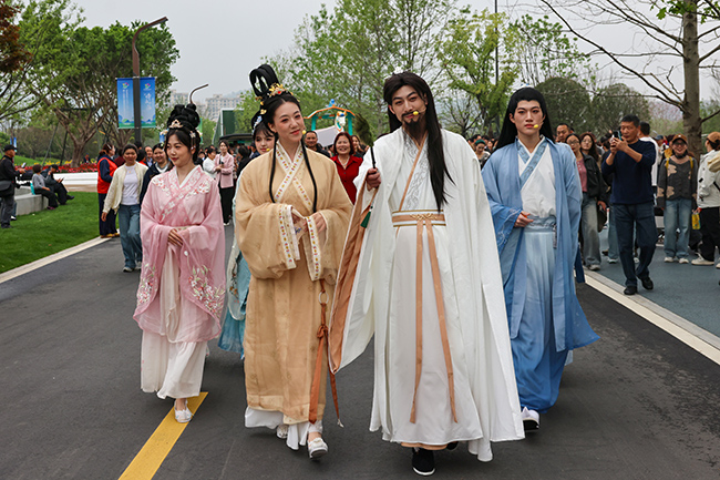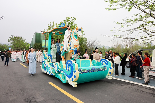 作为第十五届中国国际园林博览会核心特色活动之一,本次巡游活动以山水诗鼻祖谢灵运为“时空导游”,行进式实景演艺沿着北园核心区动线徐徐展开,《山水之约》《永嘉风华》《榕荫聚贤》等篇章轮番上演。古风花车缓缓前行,演员身着古装倾情演绎,温州鼓词、南戏、活字印刷等非遗元素融入其中,跨时空先贤对话、古今文化交融的生动场景,引得游客频频驻足、掌声不断。