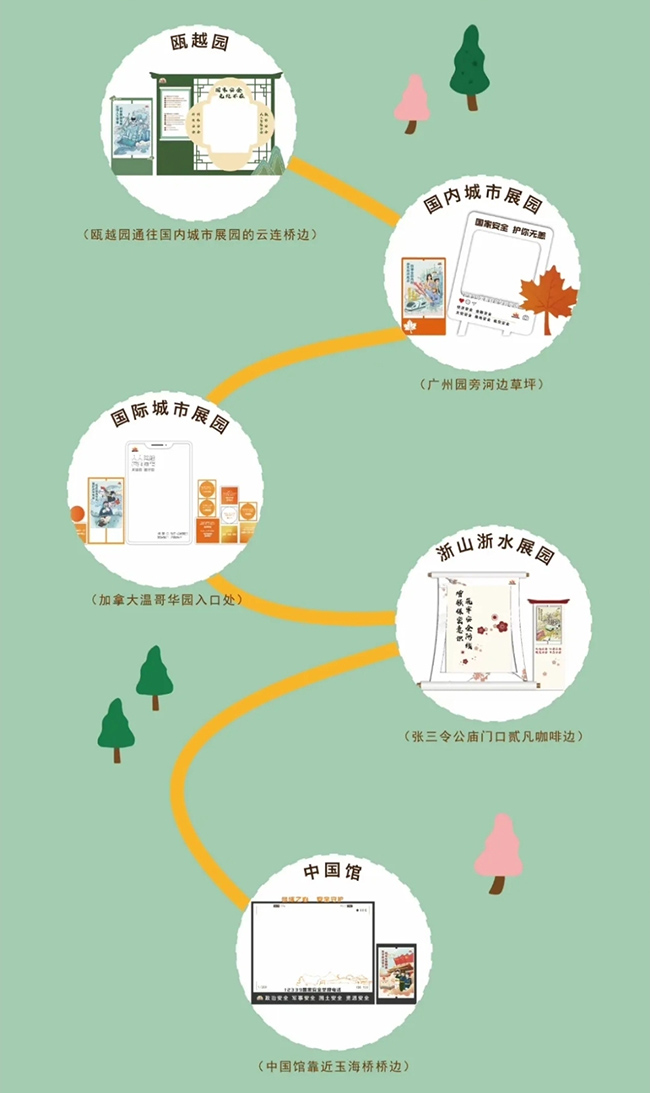 一边逛园博,一边读懂“国家安全”。市民游客可以在园博园北园主入口领取专属的打卡地图,按照导览图寻找5个主题打卡点。此次活动设置了瓯越园、国内城市展园、国际城市展园、浙山浙水展园、中国馆等5个打卡点,市民游客可以在打卡点盖章收集印记。