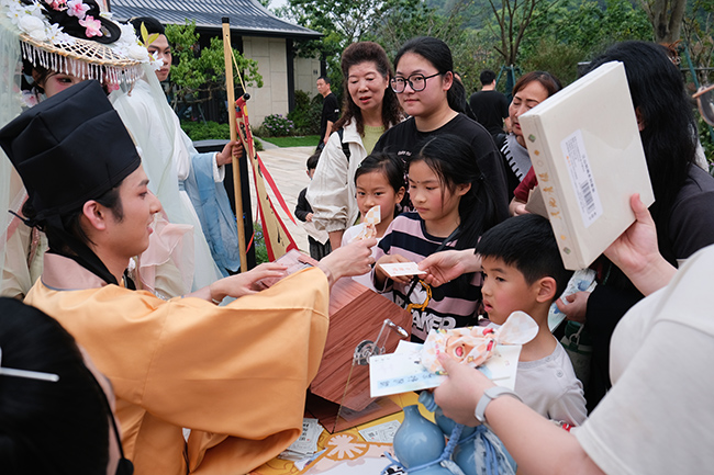 丰富的互动体验让游园更具趣味,瓯越园内还有非遗NPC互动活动,古风造型的NPC与市民游客近距离互动,大家纷纷排队打卡合影。“我是特意赶过来看园博园的,第一印象就是古色古香,而且来这里玩蛮有趣的。”市民周女士带着孩子参与互动后称赞,园区景色优美、活动丰富给她留下了深刻印象。