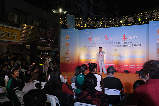 4月17日晚,新桥街道金虹东街人潮涌动,“赏园博·品美食·来新桥”2026年新桥街道美食文化嘉年华暨“声动园博·唱游瓯海”全民K歌大赛新桥赛区在此正式拉开帷幕。活动现场美食飘香、歌声不断,为市民带来一场烟火气十足的文旅盛宴。区领导胡晓立出席启动仪式。